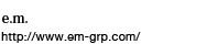 e.m. 1996年“みんながよろこぶものづくり”“ありそでなさそなものづくり”をコンセプトに仲谷英二郎、飛田眞義によって、ジュエリーとインテリアを取り扱うブランド『e.m.』設立。独創的な発想と世界観が幅広い年代に支持され、現在はセレクトショップなどへの卸事業とともに、全国に直営店を展開。またジュエリーやインテリアにとどまらず、空間やグラフィックのデザインおよびディレクションを手掛ける。